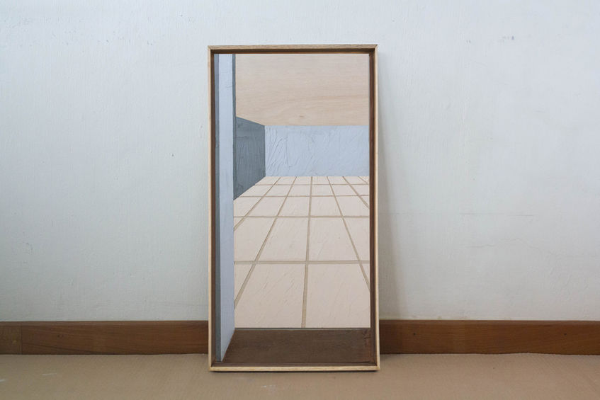 "Goh expands on a burgeoning visual practice begun in Lasalle College of the Arts, from which the artist graduated in 2016. Her works are rooted in the all-too-familiar disaffection of construction materials appropriated from the realm of functionality to create serene, balanced spaces of contemplation. Whilst the typical architectural experience requires its viewer to be entirely enveloped in its art, Goh’s two-dimensional architectural transcriptions discount physicality from the experience. These illusory spaces cannot and will not have or hold any actual thing. As such, the planarity of Goh’s works prioritizes the metaphysical; in the artist’s own words, they act as portals for escape – escape from the cacophony of life, escape from the corporeal and into the mind."