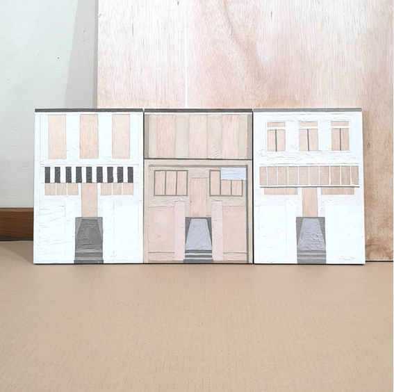 "Malaysian artist Kayleigh Goh presents a real estate shop with “listings” of shophouses from Emerald Hill. The shop hangs many delicate, textured paintings. Each work focuses on the distinct architectural features of the facades of shophouses in this conservation estate, which are often the only parts of the houses that are actually conserved. Each is a tidy, easily consumable representation of culture and heritage."